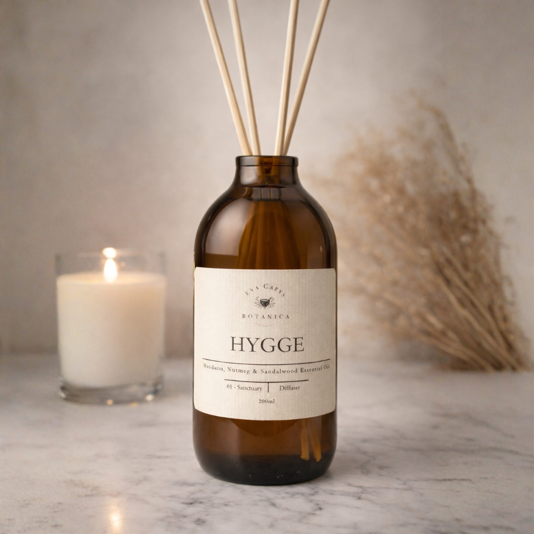 Hand-poured in our workshop, 'Hygge' is a customised blend of pure essential oils, featuring the bright cheer of Mandarin, the spicy warmth of Nutmeg, and the creamy, earthiness of Sandalwood. We believe in the power of nature, which is why our diffusers contain no synthetic fragrances, no harsh chemicals, and no artificial fixatives - just 100% natural ingredients for a clean, authentic scent.